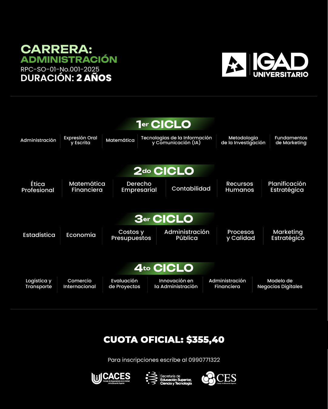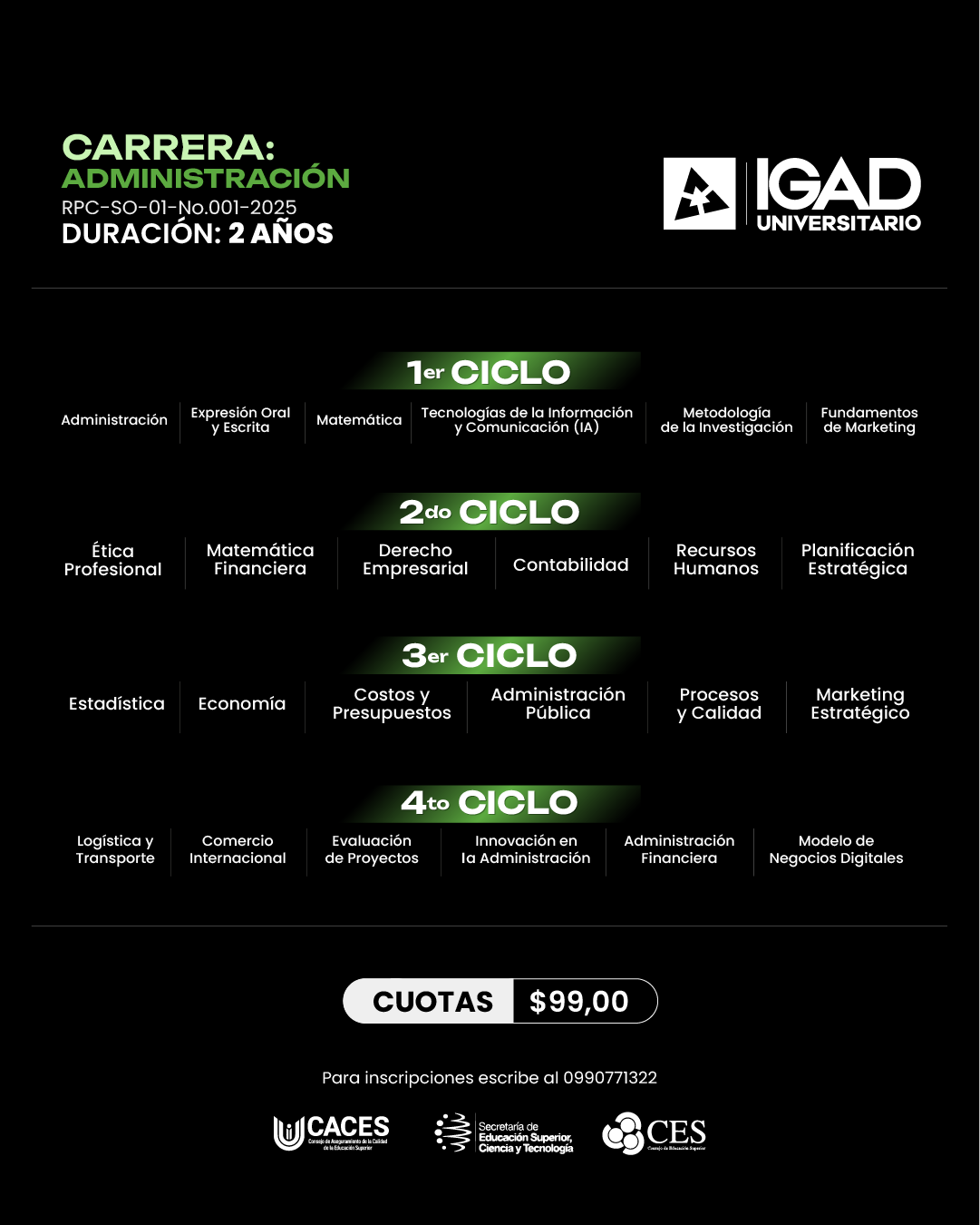 OBTÉN TU TÍTULO DE TERCER NIVEL EN TAN SOLO 2 AÑOS Estudia la carrera de: Conócenos Aprenderás cómo funcionan las organizaciones y qué necesitas para liderarlas con éxito.Desde planificar estrategias y gestionar recursos, hasta coordinar equipos y tomar decisiones clave. Descubre las herramientas para convertir ideas en resutados. PENSUM ¿Te gusta lo que ves?